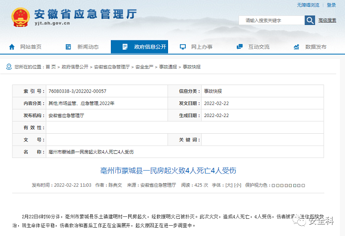 2月22日6時50分許,亳州市蒙城縣樂土鎮(zhèn)建明村一民房起火,經(jīng)救援明火已被撲滅。此次火災(zāi),造成4人死亡,4人受傷,傷者被緊急送往醫(yī)院救治,現(xiàn)生命體征平穩(wěn),傷者救治和善后工作正在全面展開,起火原因正在進(jìn)一步調(diào)查中。