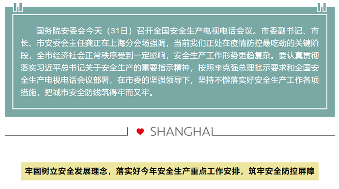 龔正指出,當(dāng)前,疫情防控是全市頭等大事,必須全力以赴、盡銳出戰(zhàn),盡快阻斷病毒傳播鏈,實(shí)現(xiàn)社會(huì)面動(dòng)態(tài)清零。在這個(gè)節(jié)骨眼上,安全生產(chǎn)工作決不能有絲毫松懈。要始終堅(jiān)持人民至上、生命至上,牢固樹立安全發(fā)展理念,落實(shí)好今年安全生產(chǎn)重點(diǎn)工作安排,筑牢安全防控屏障,堅(jiān)決遏制各類安全生產(chǎn)事故多發(fā)勢(shì)頭,堅(jiān)決遏制較大及以上安全生產(chǎn)事故發(fā)生。要層層壓實(shí)安全生產(chǎn)責(zé)任,全面落實(shí)企業(yè)主體責(zé)任,做到責(zé)任、管理、投入、培訓(xùn)和應(yīng)急處置“五到位”。從嚴(yán)排查整治安全隱患,持續(xù)深化“治已病、防未病”理念,持續(xù)鞏固“促發(fā)展、保安全”大走訪、大排查活動(dòng)成果,持續(xù)推進(jìn)安全生產(chǎn)重點(diǎn)任務(wù),持續(xù)加強(qiáng)督查檢查整改。全力抓好重點(diǎn)領(lǐng)域安全治理,聚焦涉疫場(chǎng)所、建筑工地、交通安全、特種設(shè)備、消防安全五個(gè)重點(diǎn)領(lǐng)域,抓好全過程風(fēng)險(xiǎn)管控。