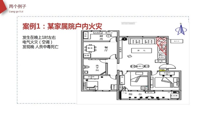 在某個(gè)夏天的晚上,很熱。這家的男主人自己在家,他睡在中間的那個(gè)臥室里面,為了涼快一些,客廳的空調(diào)是打開的,他的臥室門是打開的,其他所有的門和窗戶,全是關(guān)閉的。這很容易理解,開客廳的空調(diào),臥室不會(huì)太涼,會(huì)比較舒適。凌晨1點(diǎn)左右火災(zāi)發(fā)生時(shí),由于是電線短路,燒的很快,引燃了空調(diào)附近的窗簾、空調(diào)外罩,后來引燃了沙發(fā)墊,之后,由于屋內(nèi)門窗緊密,燃燒物缺少氧氣支撐,自燃熄滅了,火沒燒起來。第二天早上鄰居發(fā)現(xiàn)異常打了119,消防隊(duì)破拆房門進(jìn)入后,發(fā)現(xiàn)客廳起火,滿屋熏黑,然后在臥室的地上找到了死亡多時(shí)的戶主。調(diào)查認(rèn)定:戶主在熟睡中,最后雖然發(fā)現(xiàn)了火災(zāi),但為時(shí)已晚,在有毒和高溫?zé)煔怆p重作用下,無力采取更多措施,從床上起來后到地面上時(shí),即窒息死亡。