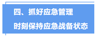 各部門、各街鎮(zhèn)、各單位要切實(shí)加強(qiáng)值班值守和應(yīng)急管理,嚴(yán)格落實(shí) 24 小時(shí)值班和領(lǐng)導(dǎo)在崗帶班制度,加強(qiáng)疫情防控、安全研判、災(zāi)害預(yù)警和應(yīng)急聯(lián)動(dòng),督促指導(dǎo)生產(chǎn)經(jīng)營(yíng)單位加強(qiáng)重點(diǎn)部位巡視檢查和突發(fā)事件應(yīng)急演練。應(yīng)急救援隊(duì)伍要時(shí)刻保持應(yīng)急狀態(tài),確保一旦發(fā)生險(xiǎn)情能第一時(shí)間進(jìn)行科學(xué)處置。