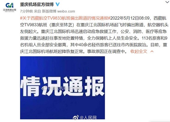 2022年5月12日08:09,西藏航空TV9833航班(重慶至林芝)在重慶江北國際機場起飛時偏出跑道,航空器機頭左側(cè)起火。113名旅客和9名機組人員全部安全撤離,其中40余名輕傷旅客已送往市內(nèi)醫(yī)院救治。目前,重慶江北國際機場航班起降恢復(fù)正常。事故原因正在調(diào)查中。(人民網(wǎng)西藏頻道)