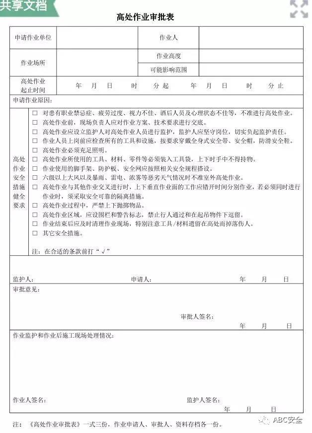 4、應(yīng)確認(rèn)具備施工條件,方可在高處作業(yè)審批表簽字,發(fā)放高處作業(yè)票,誰簽字誰負(fù)責(zé)。(可上網(wǎng)搜索“高處作業(yè)審批”、“高處作業(yè)票”獲得范本)