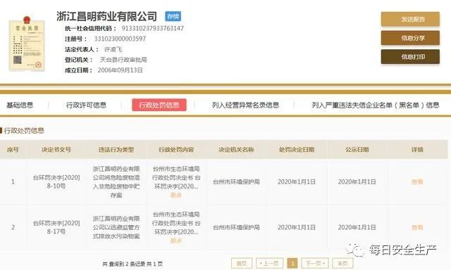 國(guó)家企業(yè)信用信息公示系統(tǒng)網(wǎng)站顯示,2020年1月,浙江昌明藥業(yè)有限公司曾因?qū)⑽kU(xiǎn)廢物混入非危險(xiǎn)廢物中貯存和以逃避監(jiān)管方式排放水污染物被臺(tái)州市環(huán)境保護(hù)局行政處罰。