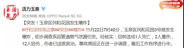 據(jù)內(nèi)蒙古呼和浩特市玉泉區(qū)委宣傳部官方微博@活力玉泉 消息,11月22日7時(shí)40分,內(nèi)蒙古呼和浩特市玉泉區(qū)民和花園3號(hào)樓發(fā)生爆炸,初步調(diào)查系因管道燃?xì)庑孤┮l(fā)。