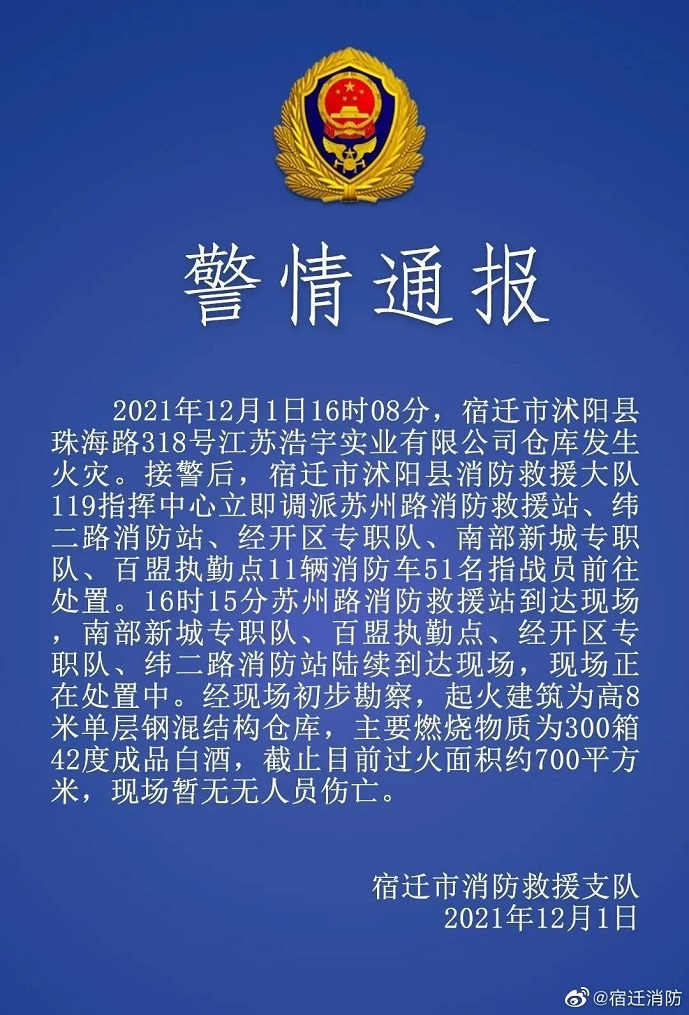 經(jīng)現(xiàn)場初步勘察,起火建筑為高8米單層鋼混結(jié)構(gòu)倉庫,主要燃燒物質(zhì)為300箱42度成品白酒。
