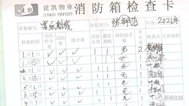 沒過多久,消防趕到,迅速滅火并將趙女士的丈夫救了出來,但不幸的是趙女士的丈夫在送醫(yī)之后還是去世了。記者隨后查看了趙女士家門前的兩個消防栓,發(fā)現(xiàn)消防栓目前都能正常出水,且門上的消防箱檢查卡,也有物業(yè)防范部的工作人員定期檢查填寫。趙女士認(rèn)為,事發(fā)時消防栓沒有水,間接導(dǎo)致了她丈夫的死亡。